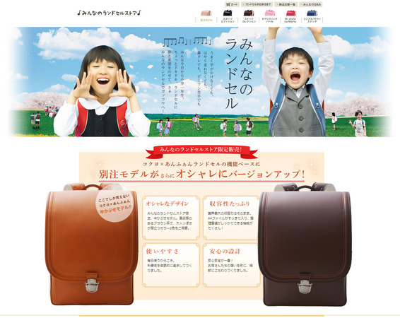 『みんなのランドセルストア』は、ママの声からできた大人気のランドセル「コクヨ×あんふぁんランドセル」を中心に扱うランドセル専門の販売サイトです。おじいちゃんやおばあちゃんなど、おねだりしたい相手にランドセルの情報を送る「おねだり機能」や、ひと目で購入検討者の数がわかる機能を搭載し、2014年度に小学校へ進級する子を持つ親への販売訴求を狙います。
