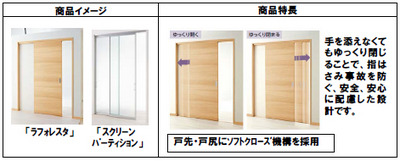 安全性を高める様々な機能を盛り込んだ室内用スライディング戸のシリーズです。ソフトクローズ機構を戸先・戸尻に付け、手を添えなくてもゆっくりと閉じることで指はさみに配慮した仕様にしました。また、上枠と本体を部品で結束しているので、子供が誤って衝突したり、地震などの揺れが起きても扉が脱落せずに安全にお使いいただけます。敷居に採用した新構造のラウンドレールは、従来に比べゴミやほこりがレールと戸車の間にはさまりにくく、ビスも露出しない構造であることから、清掃性に優れ裸足でも安全な工夫を取り入れています。