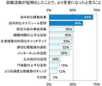 まず、「就職活動が短期化したことで、より重要になったと思うこと」を複数回答形式で聞きました。この質問に対して最も多かったのは、64%が答えた「効率的な情報収集」でした。また、2位「効率的なスケジュール管理」(49%)、4位「隙間時間の上手な活用」(35%)、5位「企業情報の的確なキャッチアップ」(33%)といった具合に、上位には、就職活動の効率化を促す項目が並びます。