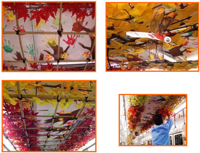 今季は、「レールウェイフェスティバル2013秋(10月26日開催)」の会場に「百年:もみじ」作成コーナーを設置し、地域のお子様にお手伝いをしていただき、お子様の手形を「もみじ」の葉にみたて、秋の能勢里山に燃ゆる秋を表現した天井絵を一緒に作成しました。また、天井絵の周りには、能勢の里山をかたどる秋の紅葉を飾ります。
