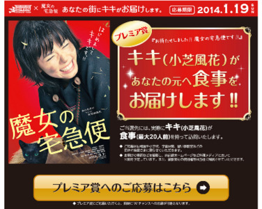 夢の街創造委員会株式会社(代表取締役社長 中村利江、大阪府大阪市)が運営する、出前・デリバリー総合サイト『出前館』は、2014年3月1日より全国ロードショーの映画『魔女の宅急便』とのタイアップ企画として、ご応募いただいた施設や団体に映画で主役のキキを演じた小芝風花が、劇中と同じくキキの姿で、直接お食事(出前)をお届けするキャンペーンを実施します。