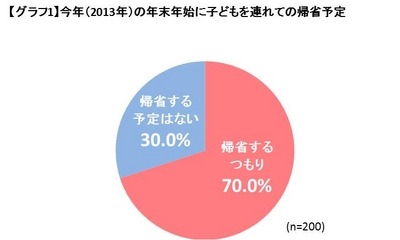 小学生以下の子どもを持ち、かつ自分の親と離れて暮らしている人たちは、自分の子どもと親、すなわち孫と祖父母のコミュニケーションについてどう考えているのでしょうか。まず、「今年(2013年)の年末年始に子どもを連れての帰省予定」はありますかと聞いてみたところ、「帰省するつもり」が70.0%と大半を占めました【グラフ1】。やはり年末年始は実家で過ごす家族が多いようです。