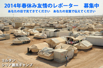 2014年春休みの「友情のレポーター」(2名を予定)は、KnKの海外活動国のひとつであるヨルダンのシリア難民キャンプの子どもたちを訪ね、彼らが抱える問題、その生活状況、そして現地で行われている支援活動の様子などを取材する予定です。