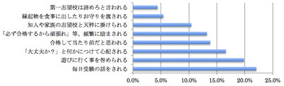 上記の結果から、受験生が最も嫌なことが両親からの心配や干渉という結果でありながら、親としては過程が大事と言いつつも、子供に対し余計な心配や干渉をしてしまうという悪循環が存在することが、調査結果から見て取れます。