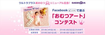 『ウルトラプラス』の紙おむつのリニューアルを記念して、「おむつアート」※2コンテストを開催します。赤ちゃんと紙おむつで演出した、とっておきの写真をご応募ください。1次審査で100作品を選定し、ベビーザらス公式Facebookページにて一般投票を行ないます。投票期間中に「いいね!」を獲得された上位3名様および1次審査を通過された100名様全員に、素敵な賞品をプレゼントします。