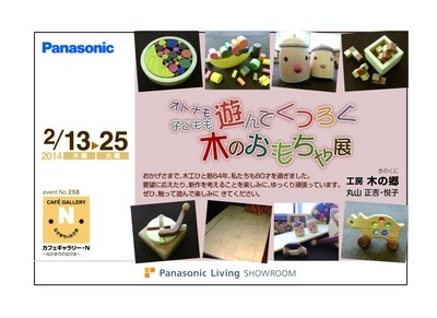 パナソニック株式会社 エコソリューションズ社は、住宅設備総合ショウルームである「パナソニック リビング ショウルーム 広島(広島県広島市中区中町7-1) 」の2階 喫茶内のギャラリーコーナー「カフェギャラリー・N」において、2014年2月13日(木)より、オトナも 子どもも 遊んでくつろぐ「木のおもちゃ展」を開催します。
