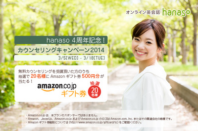 株式会社アンフープ(所在地:静岡県富士市、代表取締役社長:重森 渉)がサイト運営する、無料通話ソフトSkype(スカイプ)を利用したオンライン英会話スクール「hanaso」では、2014年3月5日(水) ~3月18日(火)に、有料会員への申込を検討されている方で、無料カウンセリングを受講いただいた方の中から抽選でギフト券が当たる「カウンセリングキャンペーン2014」を実施いたします。