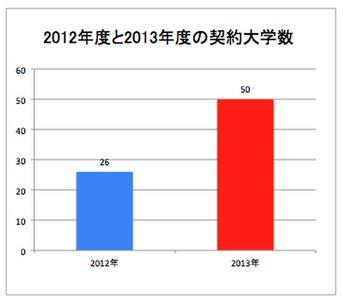 EnglishCentralにおいても、この発信型スキルへのトレンドは顕著に現れている。2011年から一般の利用者だけでなく、大学や企業にスピーキングスキルを高める動画や音声録音機能がついた英語学習形態を提供しはじめたが、契約大学の数は2012年度の26校から2013年度にかけて50校まで急増している(グラフ1)。その後も、国立福井大学や関西学院大学などでグローバル人材育成事業の一環として大規模採用が進むなど、安価で時間制限のないスピーキングの練習を特徴とした学習サービスの需要が拡大しつつあることがうかがって取れる。