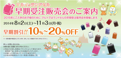 株式会社丸井(本社:東京都中野区、取締役社長:中村正雄)では、2014年8月2日(土)~11月3日(月・祝)まで、下記8店舗にて2015年モデルランドセルが10~20%OFFになる「早期割引 受注販売会」を開催いたします。6年間使う物だから、しっかり選びたいですよね?機能重視のかたも、カラー・デザイン重視のかたも選べる品揃えでお待ちしております。