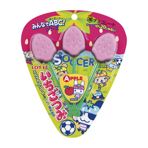 2.苺チョコとセピアチョコの2層タイプの、苺型の棒付きチョコ。3本入り。
