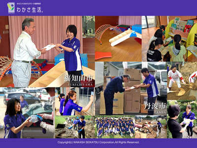 株式会社わかさ生活は、京都府福知山市・兵庫県丹波市の集中豪雨被害において、現地に直接赴いて清掃活動を実施し、飲料水・雑巾・タオルなどの総額2,500万円を超える救援物資を手渡しで届ける活動を行ない、浸水被害で全壊・大規模半壊を受けた兵庫県丹波市の世帯に対し約380万円相当の家具や家電製品などの生活に必要な物の寄贈を行なってきました。そしてこの度、京都府福知山市の療育施設への約100万円相当の療育遊具と約1,000冊の書籍寄贈を行ないました。