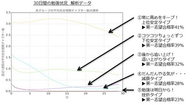 勉強スタイル別に受験生を5タイプに分けることができました。そして実はタイプによって第一志望校の合格率に大きな差があることが判明・・・少しずつでも『コツコツ』勉強することが合格への近道のようです。