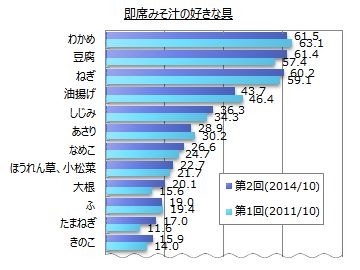 ■即席みそ汁の好きな具は「わかめ」「豆腐」「ねぎ」がトップ3。北海道等では「しじみ」が多い
