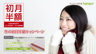 株式会社アンフープ(所在地:静岡県富士市、代表取締役社長:重森 渉)がサイト運営する、無料通話ソフトSkype(スカイプ)を利用したオンライン英会話スクール「hanaso」では、2014年11月13日(木) ~12月15日(月)に、新規会員登録の方全員、初月月額料金(3,800円~9,600円)(税別)が半額になる「冬の初月半額キャンペーン」を実施いたします。
