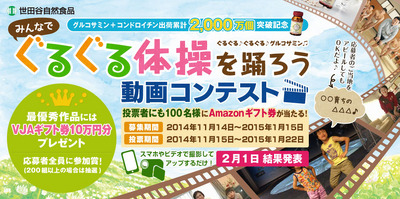 人気の火付け役となったのは、多くの方に口ずさまれている「ぐるぐる♪ぐるぐる♪グルコサミン♪」のテレビコマーシャルであることは間違いありません。そこで今回、売上個数2,000万個突破を記念して、「みんなで“ぐるぐる体操”を踊ろう動画コンテスト」を開催致します。