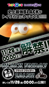日本トイザらスは、この度初めて「ブラック・フライデー」に挑戦し、11月28日(金)深夜0時より、専用ページ( http://www2.toysrus.co.jp/rm/2014/BF.html )にてセール情報を発表します。全国のトイザらス、ベビーザらス店舗では、同日から11月30日(日)までの通常営業時間※1内に、「トイザらス・ベビーザらス オンラインストア」では、同日深夜0時から11月30日(日)23時59分まで、それぞれ3日間限定で実施します※2。対象商品は、クリスマスプレゼントにもぴったりな人気商品計26アイテム※3で、50%から最大79%オフの大特価でご提供し、今シーズンのクリスマスショッピングを盛り上げてまいります。