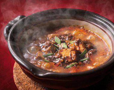 味噌風味のスンドゥブスープの中に中国のたまり醤油と黒色の豆板醤(トウバンジャン)で作った黒い麻婆豆腐を入れました。土鍋で提供いたします。