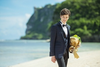 華やかにリゾートウェディングを飾る流行色のシャンパンゴールドのタキシードが「Avica uomo」ブランドで初登場。ドレスとの相性も抜群の色目で、フォーマル感の高いモーニングカット&着丈短めの新スタイルで着る人を選ばないデザインです。細めのナローラぺルとナロータイがシャープでスタイリッシュに印象づけます。