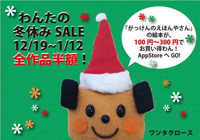 株式会社学研ホールディングス(東京・品川 代表取締役社長: 宮原博昭)のグループ会社、株式会社学研教育出版(東京・品川 代表取締役社長:碇 秀行)は、3月にオープンした、iOS専用の電子絵本アプリ「がっけんのえほんやさん」のコンテンツ全33タイトルを、半額以下にて販売いたします(期間限定)。「がっけんのえほんやさん」のマスコットキャラクターわんたからの、クリスマス・お正月プレゼントです!