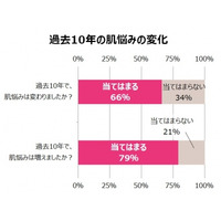 「毛穴の黒ずみ」「にきび」から「ハリ・弾力のなさ」「しわ」へ… 肌悩みは、年齢とともに“変化”&“増加”! 一方、「年齢に合わせたスキンケア」が十分にできている女性は、わずか1割弱