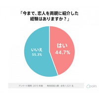 「両親に恋人を紹介したことがある」女性は44.7%。女性の半数近くが一度は両親に恋人を紹介した経験があ…