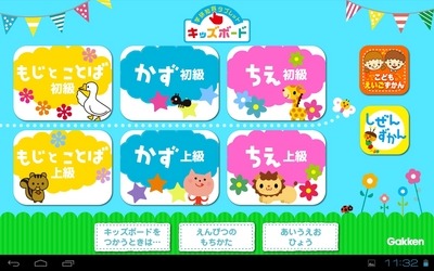キッズボードは、「もじとことば」「かず」「ちえ」(各初級・上級)84コンテンツに「えいご」「ずかん」「えんぴつのもちかた」「あいうえおひょう」の4コンテンツを加えた計88コンテンツ518課題を一つのタブレットに搭載しました。