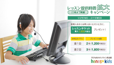 株式会社アンフープ(所在地:静岡県富士市、代表取締役社長:重森 渉)がサイト運営する、無料通話ソフトSkype(スカイプ)を利用した子ども向けオンライン英会話スクール「hanaso kids」では、2015年1月27日(火) ~2月11日(水)に、期間中に新規入会または再入会された方へレッスンチケット最大1,800円相当をもれなく進呈する「レッスン提供時間拡大キャンペーン」を実施いたします。