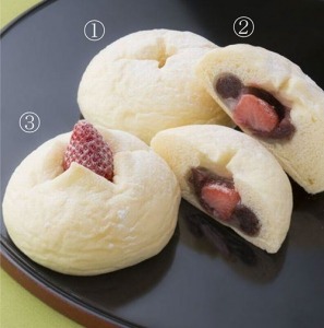 苺大福をパンで表現し、つぶあん入りと、白あん入りの2種類をご用意。パンの中にぎゅうひ(※)を包んでいるのでもちもちとした食感をお楽しみいただけます。