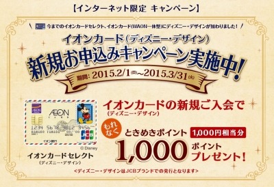 インターネットより期間中、イオンカードセレクト(ディズニー・デザイン)・イオンカード(WAON一体型/ディズニー・デザイン)にへの新規ご入会でもれなくときめきポイント1,000ポイントプレゼント。