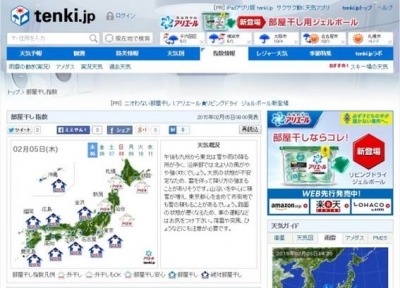 2015年2月9日(月)より、日本気象協会が運営する天気予報専門サイト「tenki.jp(http://www.tenki.jp/indexes/room_drying/)」で全国142地点**の『部屋干し指数』をご覧いただけます。