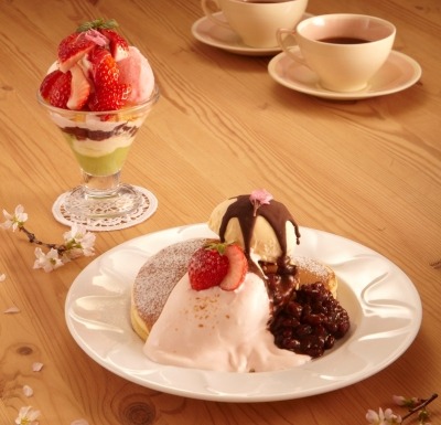 ほんのりピンク色の桜クリームと、北海道産のゆであずきをトッピングして和風に仕立てたパンケーキです。
