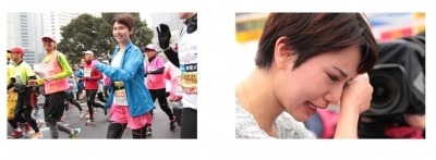スタート時の水沢アリー。カメラに笑顔を向ける余裕も。 完走後、感動で号泣の水沢アリー