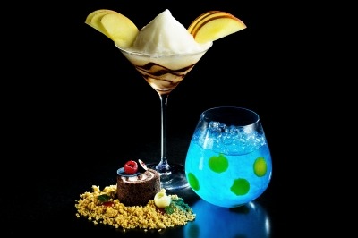 ティム・バートンの代表作にある「ブルーガールとワイン」や「絶滅寸前」からインスピレーションを 得たカクテル。アップルブランデーとチョコレートを使用した甘酸っぱい、デザート感覚のフローズン カクテルです。最初はそのままで、最後はチョコレートソースと混ぜながらお愉しみください。