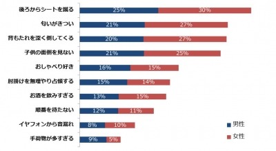 1位には男女ともに「後ろからシートを蹴る」という回答があがりました。続いて「匂いがきつい」「背もたれを深く倒してくる」「子供の面倒を見ない」という結果となり、ほぼ、男女とも同順位で続いています。