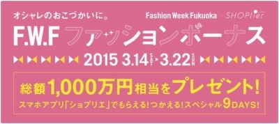 株式会社リクルートライフスタイル(本社:東京都千代田区、代表取締役社長:北村吉弘)が運営するファッションアプリ「ショプリエ」は、3月14日(土)から開催されるファッションウィークウィーク福岡(F.W.F)2015とのコラボレーション企画としてショプリエデジタルクーポン総額1,000万円相当が当たるコラボレーションキャンペーンを行います。