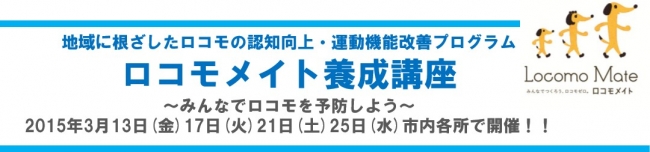 ロコモチャレンジ!推進協議会は、2015年3月13日(金)、17日(火)、21日(土)、25日(水)の4日間、横浜市内各4ヶ所の施設で、骨や筋肉など運動器の障害のために、移動機能の低下をきたした状態「ロコモティブシンドローム」(通称:ロコモ)の予防を目的とした「ロコモメイト養成講座」を開催します。