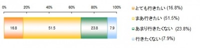 3月14日に金沢・富山~東京間の開業を迎える北陸新幹線を利用する旅行について聞いたところ、全体では「とても行きたい(16.8%)」、「まあ行きたい(51.5%)」の合計68.3%が旅行意向を示している。居住地域別では、首都圏が他地域よりも圧倒的に多く、「とても行きたい(28.2%)」と「まあ行きたい(55.3%)」を合計すると83.5%もの人が北陸新幹線を利用する旅行への意向を示している。また、東海圏でも54.8%、関西圏でも66.5%と半数以上の人が意向を示している点も注目される。