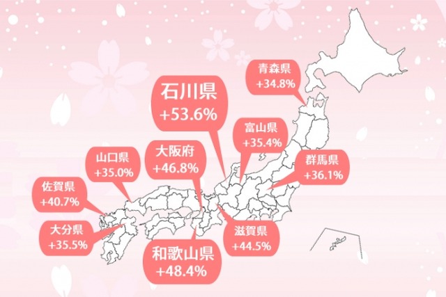 石川県は北陸新幹線開業により、首都圏からの交通利便性が向上したことから、春の旅行先として急速に人気を高めました。特に予約が伸びた金沢市内・周辺エリアでは、開業に伴い兼六園での朝食メニュー拡充、また開業記念の特別機関(3月14日~22日)や桜開花時期(4月中予定)にライトアップが開催されており、この時期ならではの観光が満喫できます。また、金沢市内・周辺エリアだけではなく能登・輪島・珠洲エリアも予約が好調です。桜の時期に訪れたい能登鹿島駅は、プラットフォームの両脇に植えられた約百本の美しい桜がトンネルをつくり、通称「能登さくら駅」と呼ばれる有名なお花見スポットです。また、能登の輪島市は2015年春からスタートする朝の連続テレビ小説の舞台となっており、話題が尽きません。