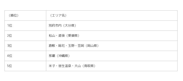 広島県民は中国地方外への旅行が多く、新幹線と特急ソニック号で別府駅まで約2時間と、アクセスの良い日本一の源泉数、湧出量を誇る別府温泉が1位となりました。2位には愛媛県の松山・道後エリアがランクイン。愛媛県は広島県からバスで2時間半・高速船フェリーで1時間強で行ける身近さも魅力で、道後温泉では「道後温泉まつり 2015」などイベントが盛りだくさんです。中国地方では岡山の倉敷が3位となり、美観地区やおもちゃ王国など近場の観光スポットとして人気です。