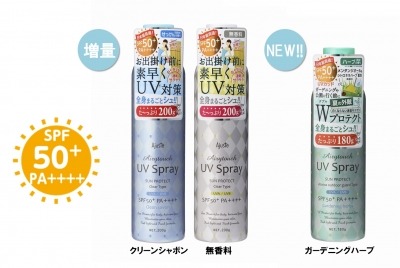 <速乾透明タイプ、顔・髪からだ用、専用クレンジング不要、汗に強い※1、逆さで使える、きめ細やかな噴射ミスト>
