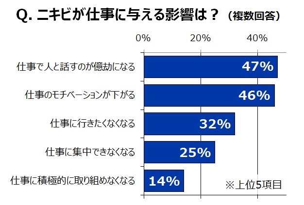 ニキビが気分をネガティブにさせていることから、仕事にも何らかの影響が出ていると予想されます。ニキビができていることで仕事に影響が出ると感じている女性は43%と半数弱で、具体的な影響としては「仕事で人と話すのが億劫になる」(47%)が最多。加えて、「仕事のモチベーションが下がる」(46%)、「仕事に行きたくなくなる」(32%)や、「仕事に集中できなくなる」(25%)といった回答も集まりました。