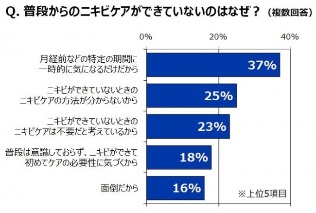 「ニキビができたときにしかケアをしていない」人に対して、普段からのケアができていない理由を聞いたところ、「月経前などの特定の期間に一時的に気になるだけだから」(37%)が最多で、「ニキビができていないときのニキビケアの方法が分からないから」(25%)、「ニキビができていないときのニキビケアは不要だと考えているから」(23%)などの回答も並びました。ニキビが日常的にできているわけではないために普段は油断をしていたり、ニキビケアの方法が分からない、あるいは日常的なケアは不要だと考えていたりと、ニキビに対して普段からケアをする意識が欠けている実態が明らかになりました。