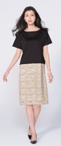 色:ブラック×ベージュ系 サイズ:3サイズ 素材:上身頃ジャージ部分・・・綿100%、スカート部分・・・表側(レース部分)麻53、レーヨン24、ナイロン19、綿4% *スカート部分は裏地付き ドライ