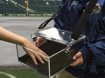 これは、専用のケースに入った「甲子園の土」をお客様の手でさわっていただくものです。