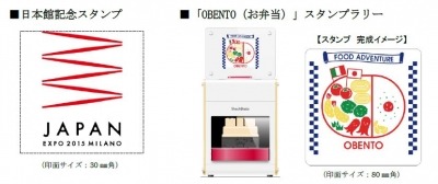 記念スタンプは、両端が細くなっている日本独自の「祝い箸」をモチーフにした日本館のシンボルマークを絵柄に採用し、日本館に来場した記念として捺(お)していただけるよう、館内2箇所に設置いたします。また、日本館に来場した子どもたちが楽しみ、思い出として残せる企画として、館内の3カ所にミラノ万博向けの電動スタンプマシーンを設置しスタンプラリーを実施します。ストラップ付の専用用紙に3種類のスタンプを順番に重ね捺(お)しすることで、イタリアと日本の国旗が立ったかわいらしい「OBENTO(お弁当)」の印影が完成するという仕組みです。日本らしいお弁当のデザインを採用することで、スタンプラリー参加者にお弁当を通して日本の食文化に触れていただくことを目指しています。