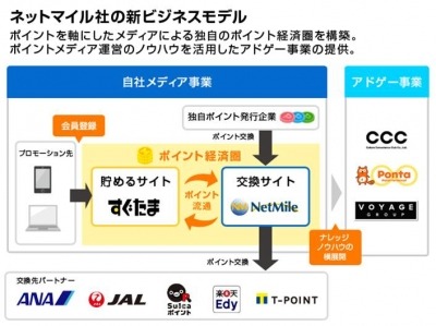 インターネット上の共通ポイントプログラムを運営する株式会社ネットマイル(本社:東京都千代田区、代表取締役CEO 畑野仁一、以下、ネットマイル社)は、ビジネスモデルを転換し、同社のサイト「NetMile」で、他社が発行する独自ポイントを交換するサービスを本日4月7日から開始します。ネットマイル社では、各社のポイントが仮想通貨のように流通する独自のポイント経済圏の構築を目指します。これにより、ネットマイル社は同社のアドゲー事業*の拡大にはずみがつくものと期待しています。