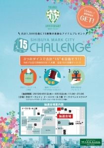 渋谷マークシティ15年間のご愛顧の感謝の気持ちを込めて、特別な抽選会を行います。ダイスカップを使って3つのサイコロを振り、「15」を記念して5・5・5のゾロ目が出れば大当たり。サイの目の合計15でも素敵な商品が当たります。 期間:2015年4月1日~4月15日(15日間)