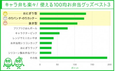 【データ】Style us株式会社の運営する、身近系happy共有サイト「gooppy」でのベスト3お題「キャラ弁も楽々!使える100均お弁当グッズベスト3(https://gooppy.jp/bests/ranking/1550)」への回答を集計。1位回答3ポイント、2位回答2ポイント、3位回答1ポイントとして集計。回答数140。