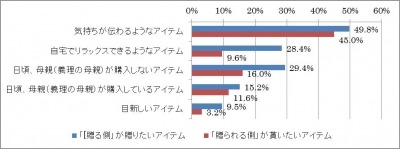 また、「贈られる側」と「贈る側」双方が「贈りたい(贈られたい)」アイテムとして、「気持ちが伝わるアイテム」と答えているものの、それ以外では共通する項目が無いなど、「期待感」以外にも、贈るアイテム(贈られるアイテム)でもズレが生じる結果となりました。