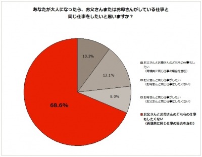 この調査で、「あなたが大人になったら、お父さんまたはお母さんがしている仕事と同じ仕事をしたいと思いますか?」と質問したところ、約7割が「お父さんとお母さんどちらの仕事もしたくない」と回答し、多くの子どもたちが親と異なる仕事に就くことを希望していることがわかりました。また、その理由としてもっとも多かったのは、「やりたい仕事が決まっているから」でした。